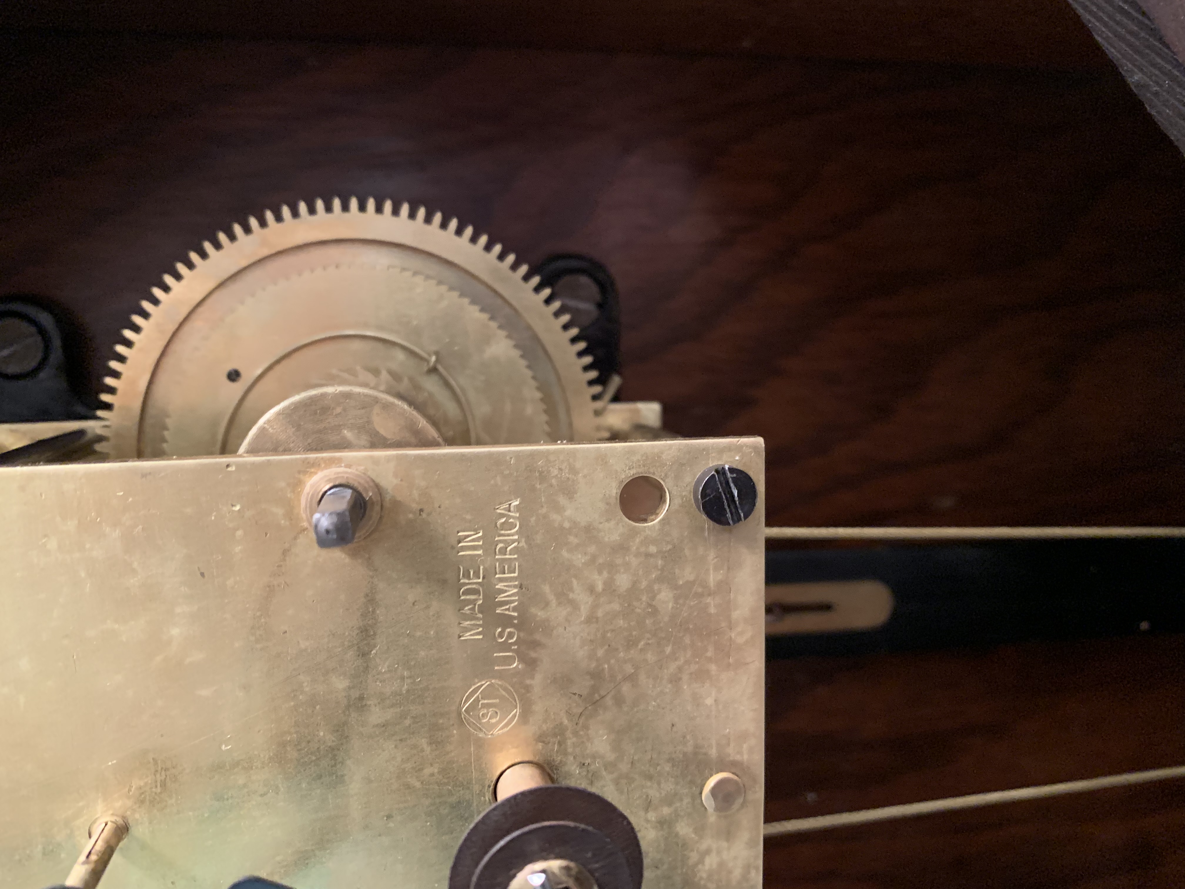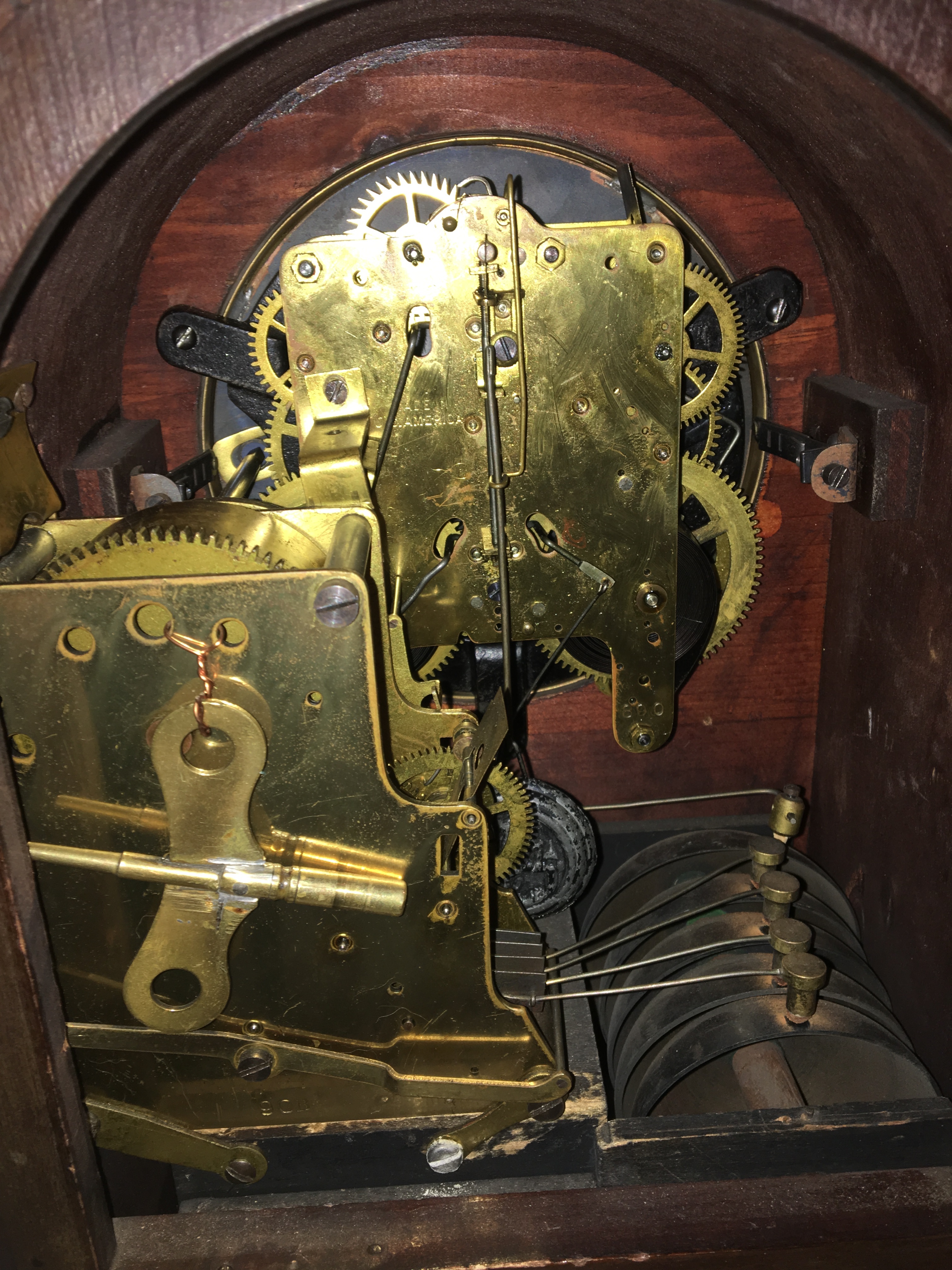 case's external shellacked wood surface is original. The interior